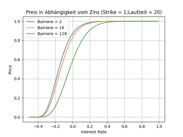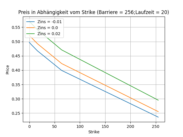Mit steigenden Zins steigt auch der Preis monoton an, ähnlich wie bei der klassischen europäischen Call Option. Diesen Umstand kann man grundsätzlich hinterfragen, denn bei herkömmlichen Bewertungsverfahren sollte der Preis eines Assets eigentlich sinken, da der Diskontierungsfaktor kleiner wird. Es wirkt aber ein weiterer Effekt. Wird größer, nähert er sich den "Up" Wert an. Damit vergrößert sich die Wahrscheinlichkeit, dass sich der Wert eines Assets zu einem nächsten Zeitpunkt erhöht. Um diesen Umstand auszugleichen, muss der faire Preis auch höher werden. Alternativ rechne man einfach nach.