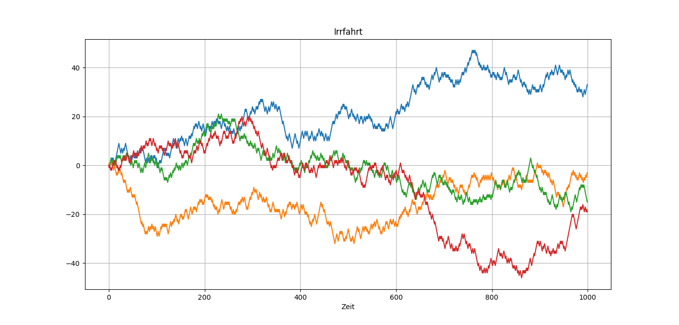 Das Hilfsmittel, welches wir benötigen, basiert auf dem sogenannten Reflexionsprinzip. Das Reflexionsprinzip wird uns bei der konkreten Berechnung von einigen exotischen Derivaten unterstützen. Wir stellen uns eine Zufallsvariable vor, welche die Anzahl der "Ups" und "Downs" zählt. Das ganze geschieht wie folgt. Wir starten zum Zeitpunkt 0 beim Wert 0. Hat man zum Zeitpunkt 1 einen "Up" so zählen wir eine 1 dazu. Haben wir einen "Down" eine -1. Auf diese Weise erhalten wir eine sogenannte "Irrfahrt". Die folgende Abbildung zeigt vier mögliche Realisierungen einer Irrfahrt, wenn die Wahrscheinlichkeit für einen "Up" und "Down" zu jedem Zeitpunkt gleich ist. Solche Irrfahrten kann man auf vielerlei interessante Eigenschaften untersuchen, z.B. ob die Irrfahrt mal einen zurückliegenden Zustand wieder erreicht.